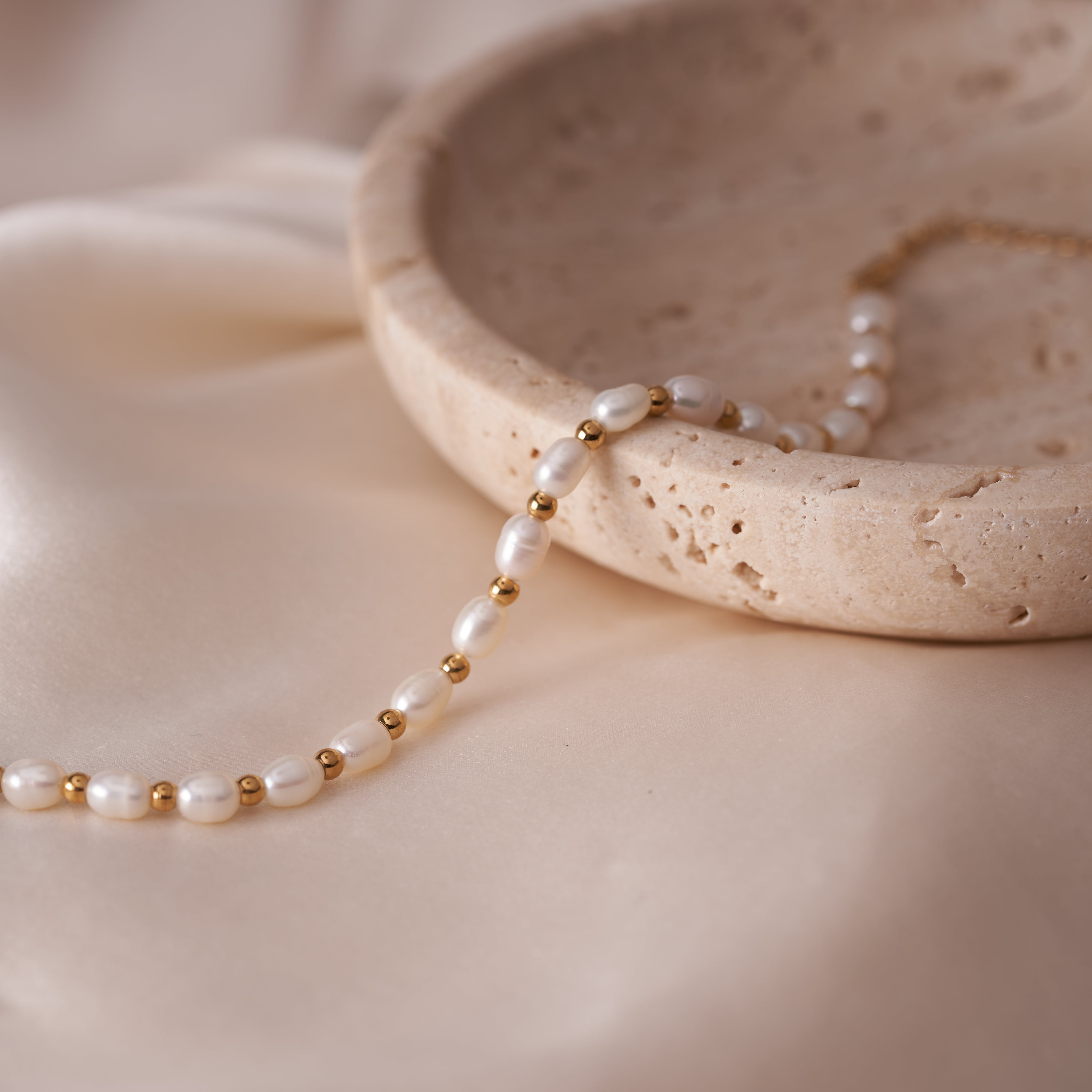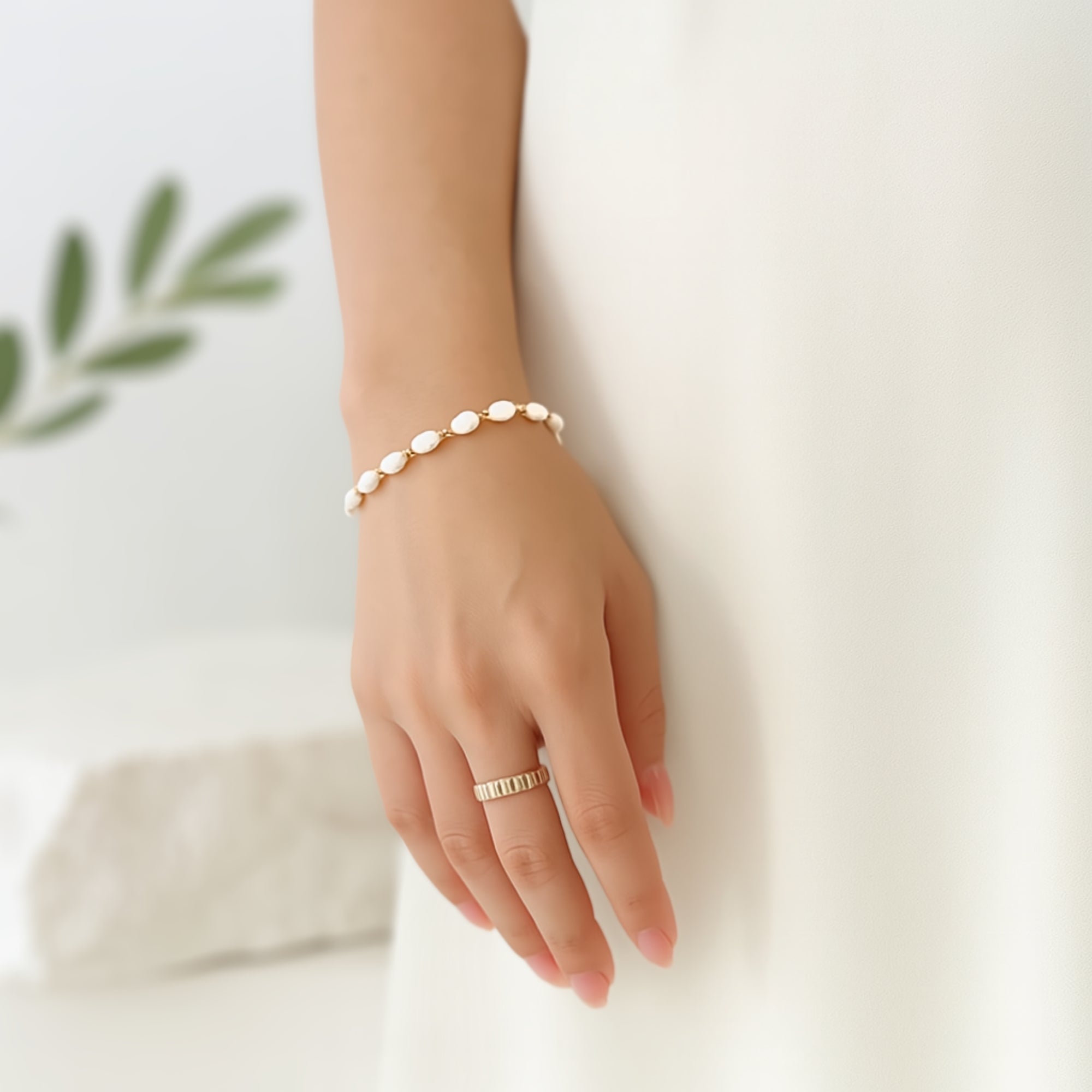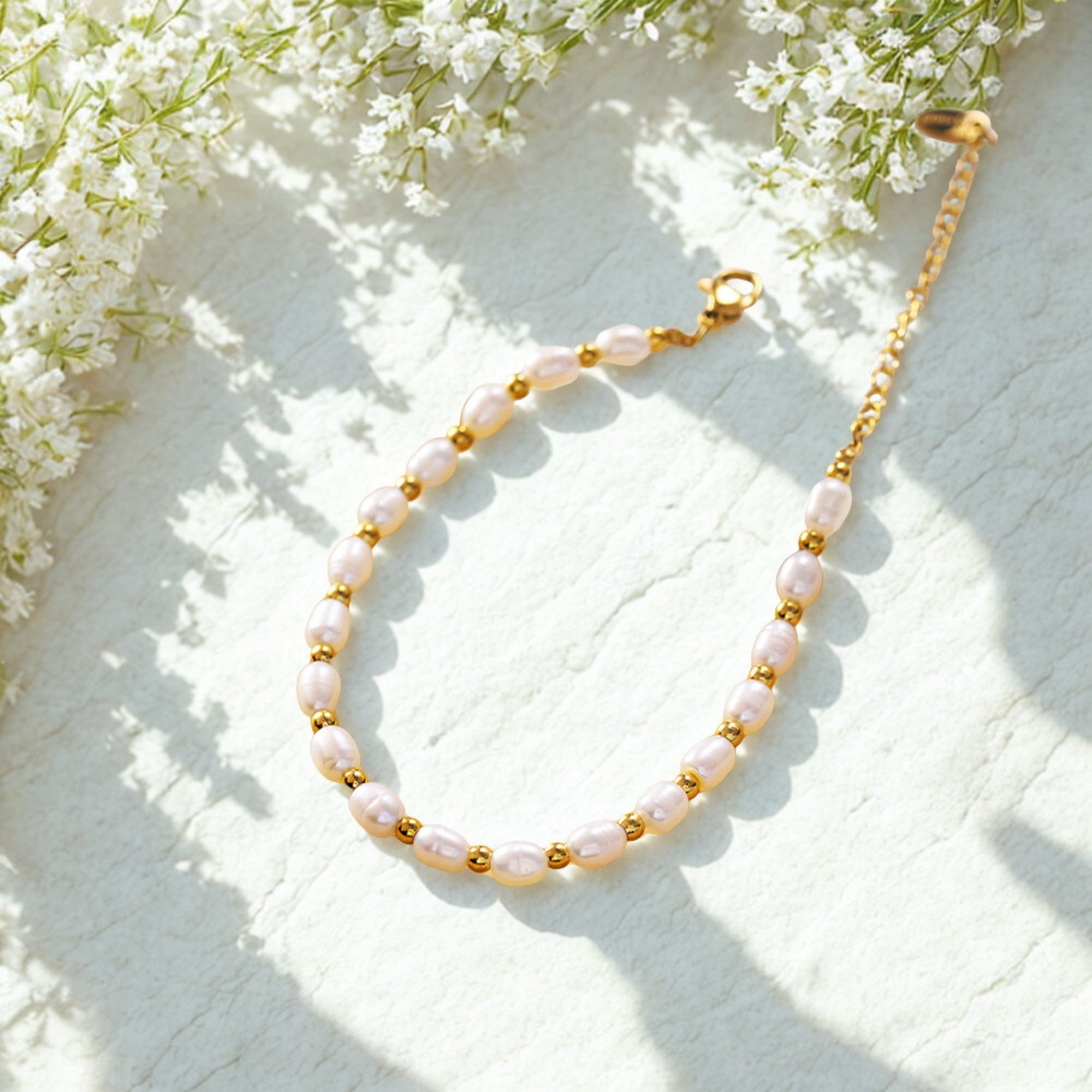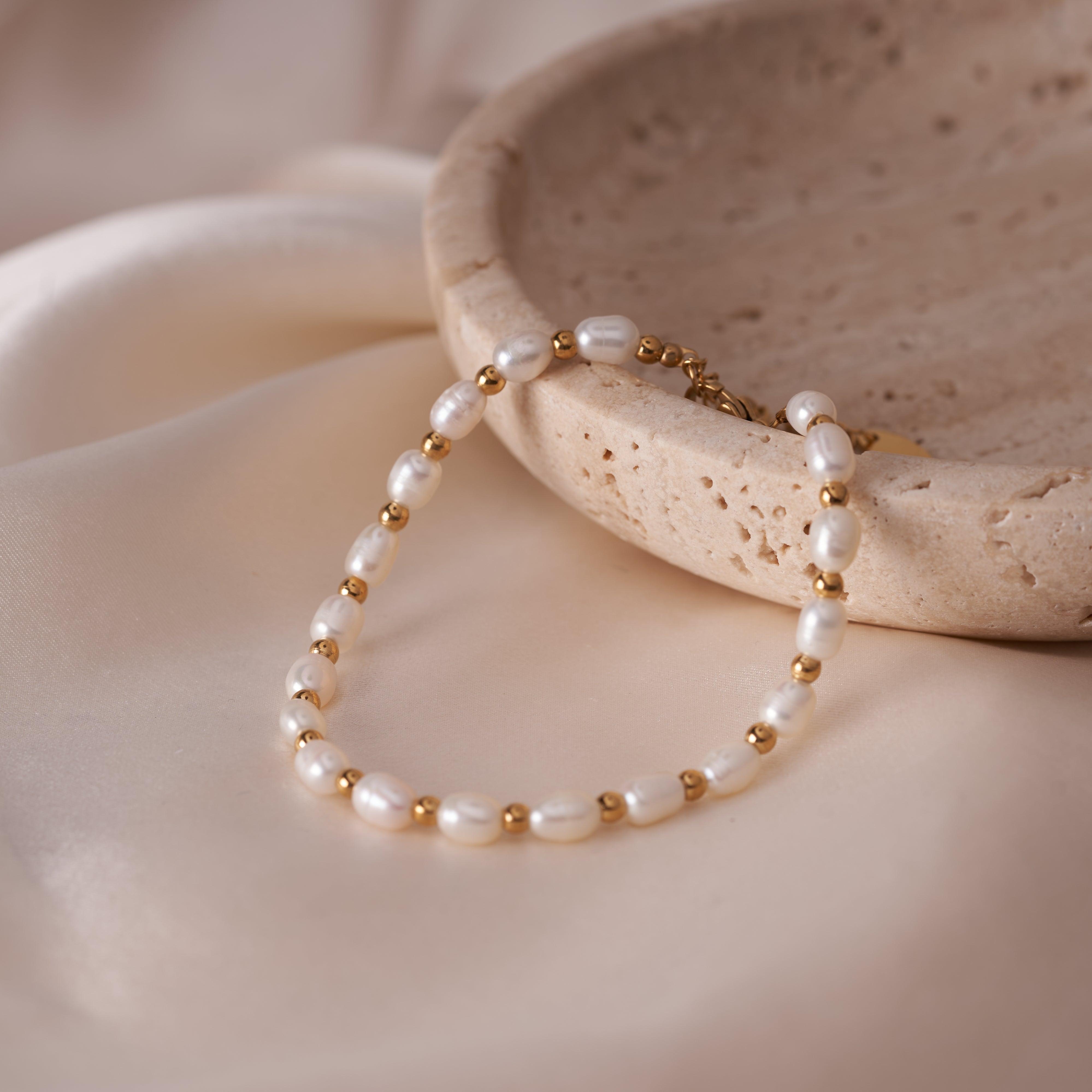 The Pearl Crown Bracelet links oval pearls and gold-toned beads in a steady, alternating pattern. Each piece has its own shape and surface variation, giving this pearl bracelet for women a more natural, tactile feel. The gold adds structure without taking over, keeping the look balanced and easy to wear. It’s a straightforward approach to pearl jewelry that highlights texture over embellishment.