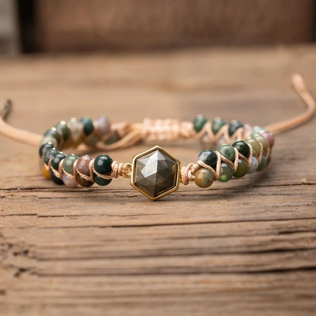 Ein wunderschön platzierter, handgeschliffener Pyritstein-Mittelteil in sechseckiger Form, umgeben von den dunklen Farbtönen des natürlichen Onyx-Steins, zusammengehalten durch echte Lederstreifen für ein filigranes Design, das hervorsticht.