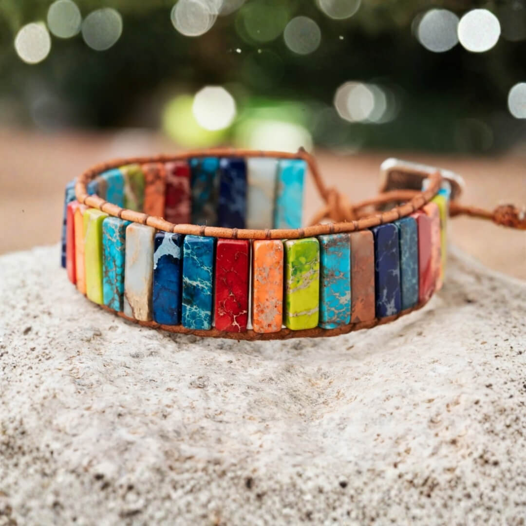 Eine farbenfrohe Zusammenstellung imperialer Jaspis-Steine in ihrer ganzen siebenfarbigen Pracht in einer auffälligen Röhrenform, die mit einem echten Lederband zusammengehalten wird und für einen definierten und modischen Look sorgt.