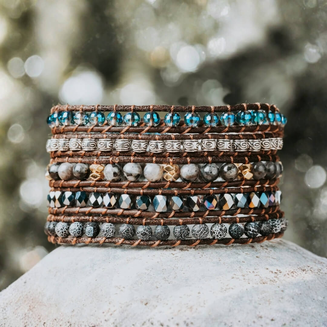 Ein geheimnisvolles fünflagiges Wunder, besetzt mit natürlichen Quarzkristallen und rustikalen Feuerachatperlen, abwechselnd in Echtlederriemen für einen schicken und symbolträchtigen Look.