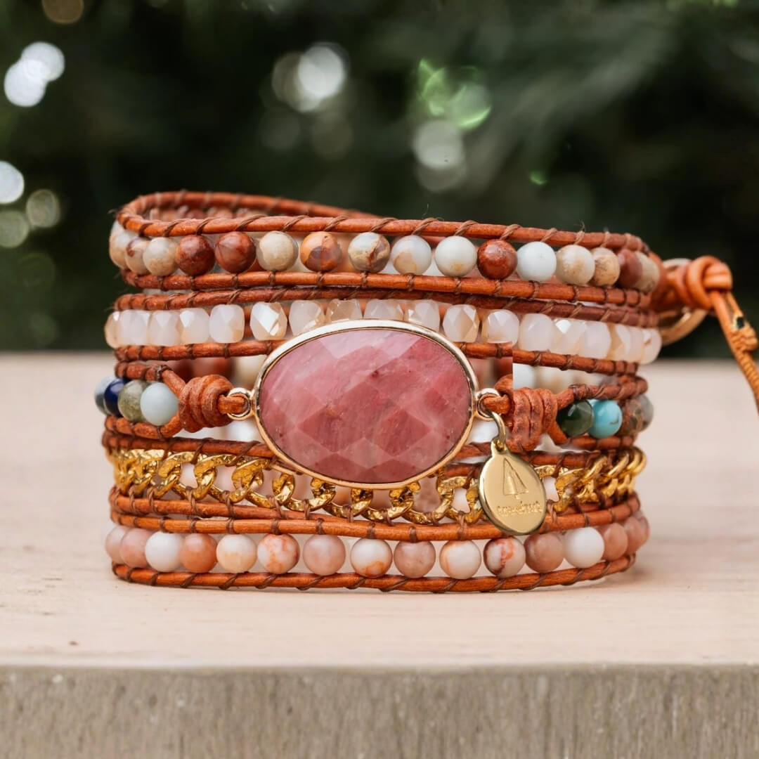 Eine harmonische Kombination aus einem rosa Rhodonit-Stein in der Mitte, umgeben von erdig getönten Jaspis-Steinen, breiten Goldgliedern und facettierten Kristallperlen, zusammengehalten durch fünf Riemen aus natürlichem braunem Leder.