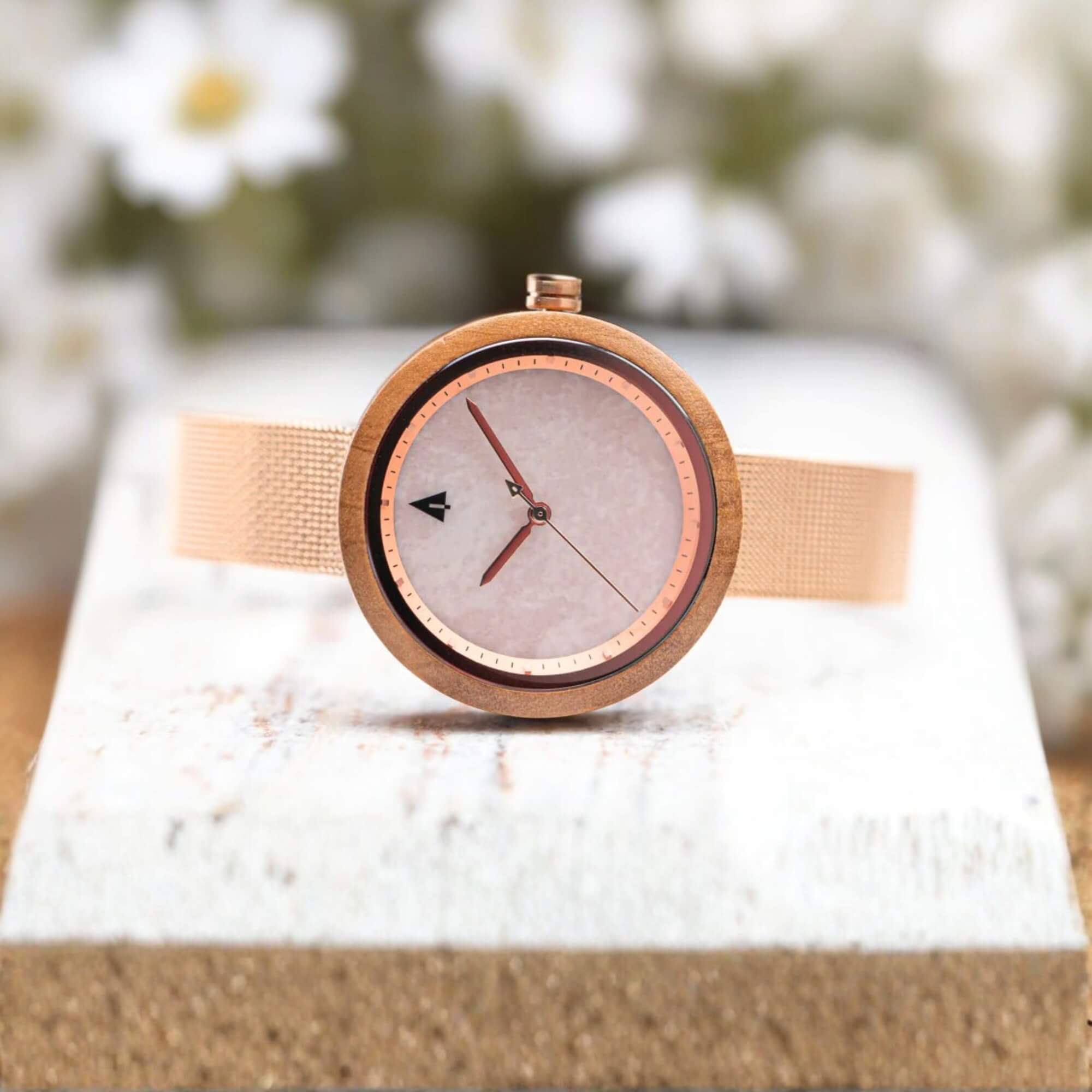Die Damenuhr Theory Rose Gold Pink Marble verfügt über ein rosa Marmorzifferblatt, ein butterweiches Olivenholzgehäuse und ein roségoldfarbenes Metallgeflechtarmband. Minimalistisches, einzigartiges Steinzifferblatt mit Akzenten aus roségoldfarbenem Edelstahl.