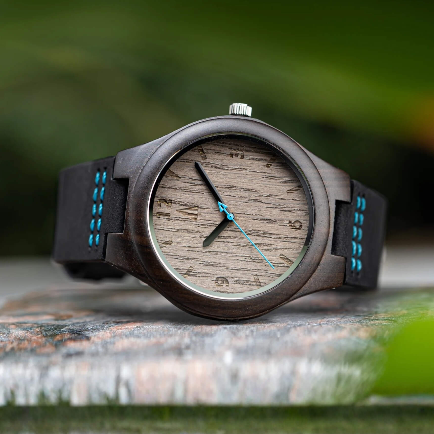 The Classic Ebony Silver Oak Blue brings this vision to life with a striking 45mm ebony wood case, a silver-accented dial, and a pop of deep ocean blue. It's powered by high-quality Japanese quartz movement and finished with a genuine leather strap. This engraved wristwatch captures the calm of nature and the confidence of fine craftsmanship. A standout among engraved men's watches, it’s meant to be worn and remembered.