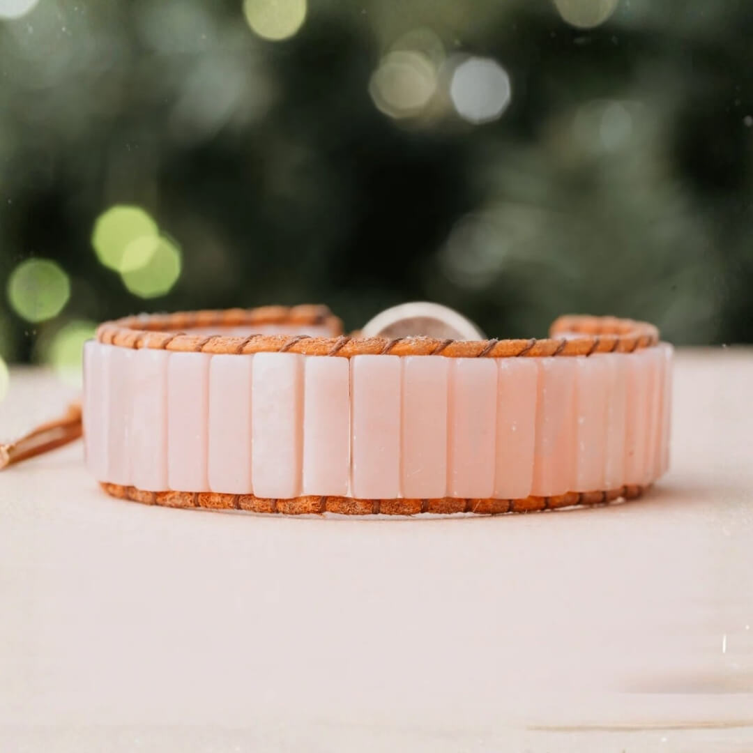 There’s a softness to the Rose Garden Opal Bracelet that draws the eye in slowly. Each rectangular bead is carved from natural pink opal and aligned by hand, then bound with warm brown leather in a single-strap wrap. This opal stone bracelet keeps the color palette minimal, letting the shape and material speak for themselves.