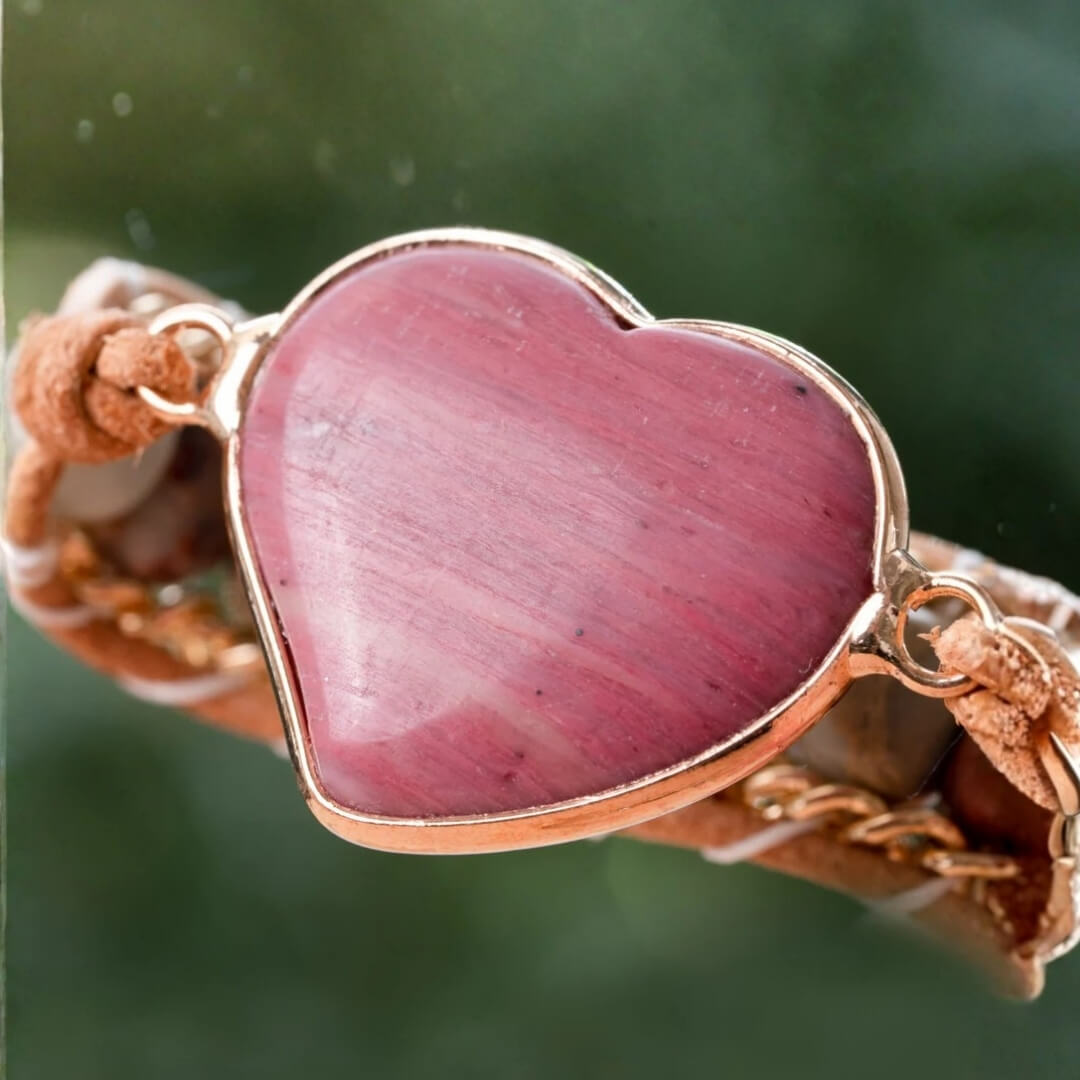 The Sweet Valentine Triple Wrap Bracelet is a handcrafted stone bracelet designed with care and intention. At its center is a rosy pink rhodonite heart, paired with earthy jasper stones and gold-toned accents, all woven into a soft leather triple-wrap strap.