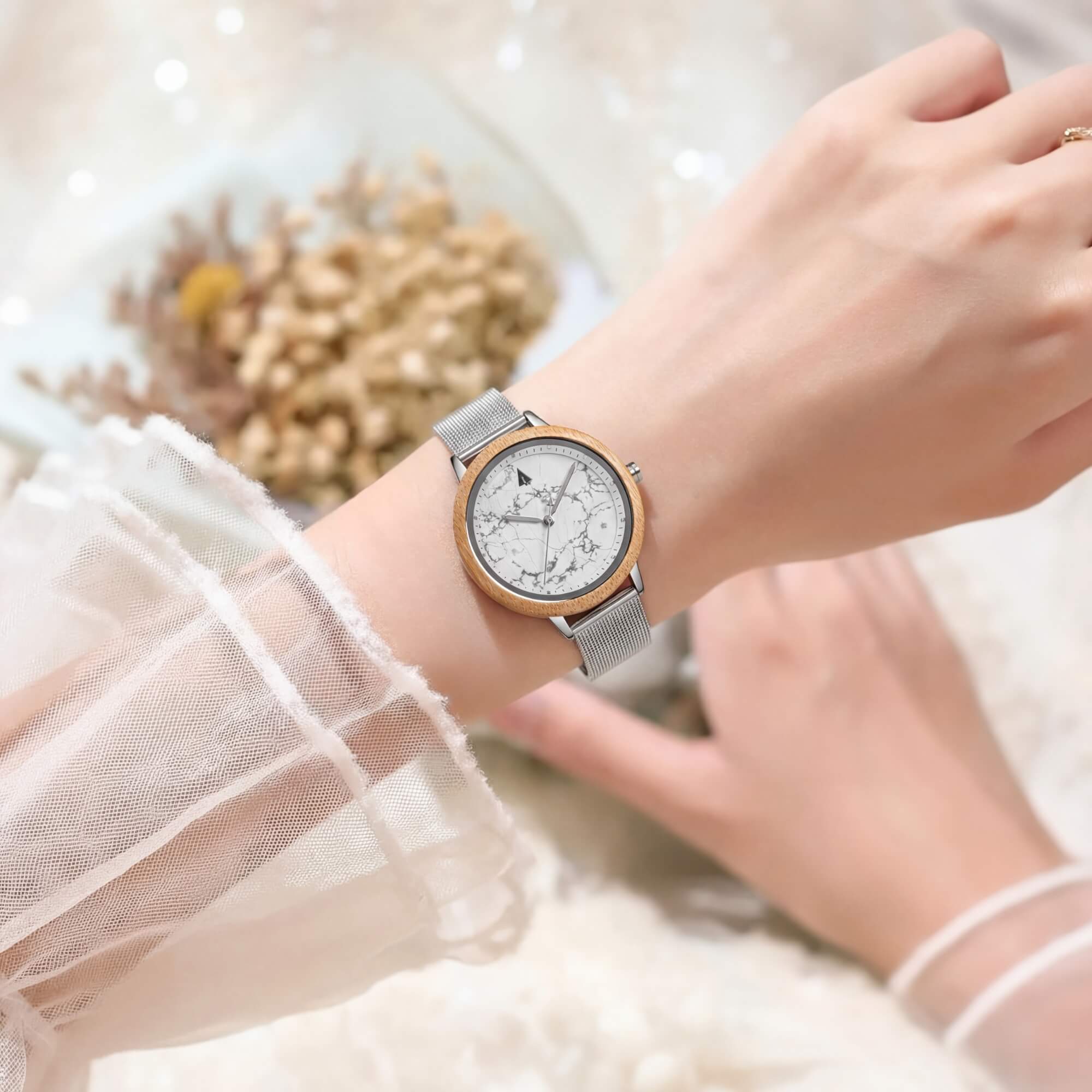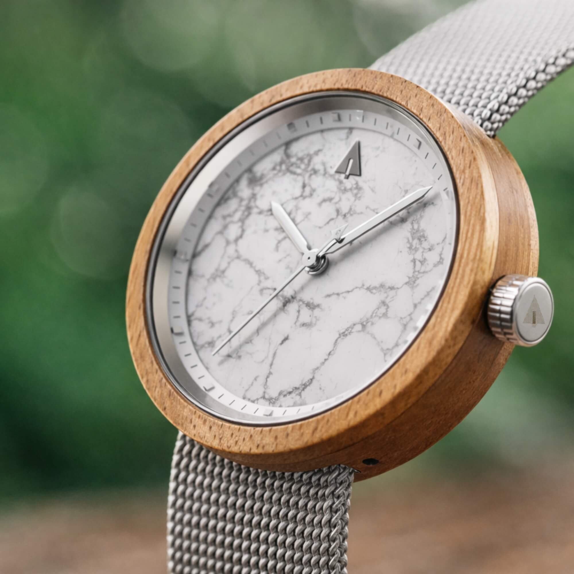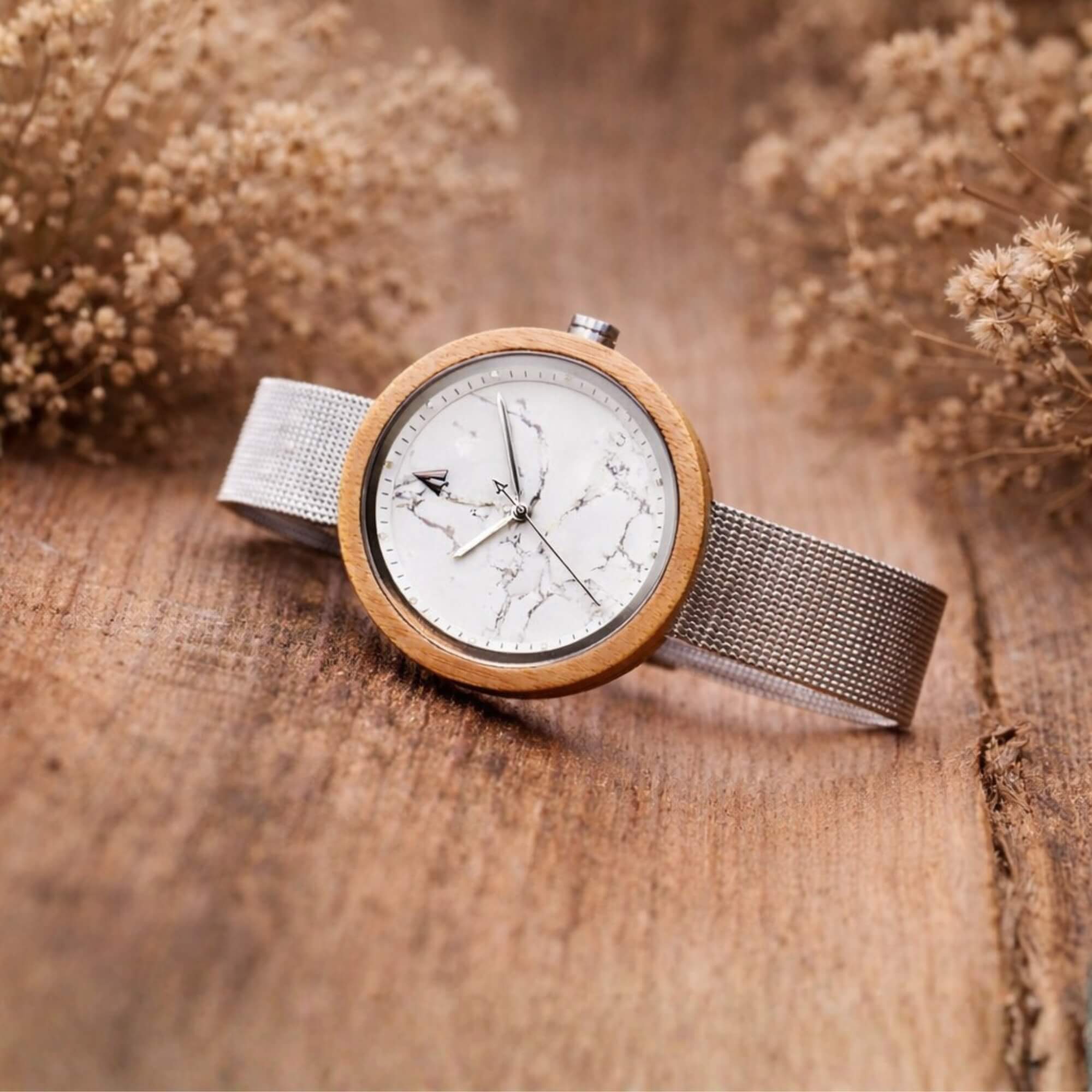 La montre pour femme Theory Bamboo White Marble est dotée d'un cadran en marbre blanc, d'un boîtier en bois de bambou et d'un bracelet en maille métallique argenté. Cadran en pierre minimaliste unique en son genre et accentué par de l'acier inoxydable argenté.
