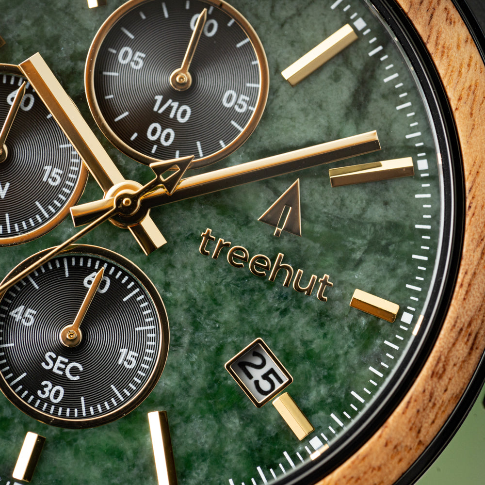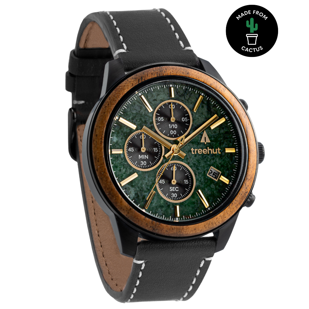 Lancez-vous dans votre quête quotidienne avec notre Quest Green Marble Cactus . Du début à la fin, cette montre captivante allie fonctionnalité et matériaux durables. Il s'agit d'un design intemporel et épuré, associé à du bois de koa et à un cadran en marbre vert qui convient aussi bien aux réunions d'affaires qu'aux fonctions sociales avec sa personnalité élégante mais aventureuse. Le bracelet noir durable en cactus est fabriqué avec du fil ivoire cousu à la main et une doublure végétalienne de haute qualité pour accentuer le bracelet en cuir texturé doux. La lunette en bois de koa et un boîtier en acier noir de 43 mm encadrent son cadran en marbre vert naturel découpé avec précision pour le chronographe à trois sous-œillets et la disposition du mouvement de date avec une minuterie jusqu'à 1/10 de seconde. Avec son savoir-faire impeccable, son look moderne et raffiné et ses performances de chronographe spectaculaires, la Quest est sans aucun doute un excellent choix pour tous les fans de montres Treehut.