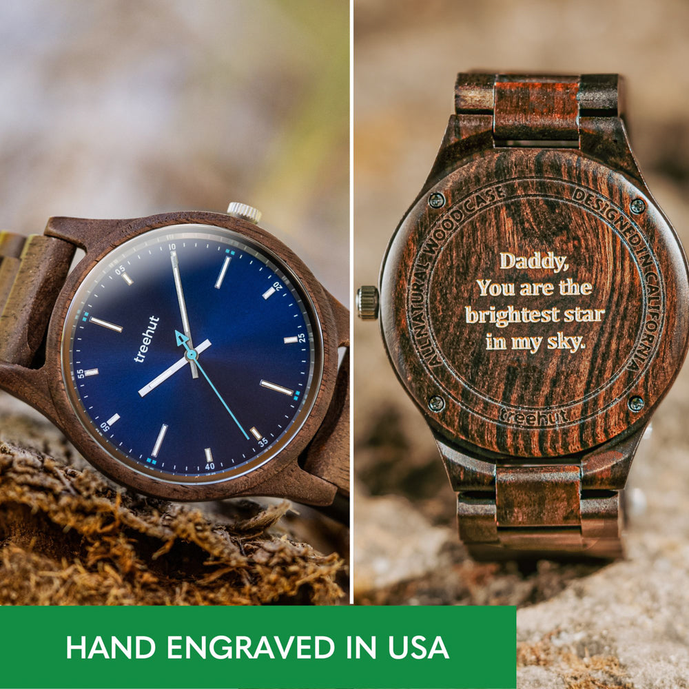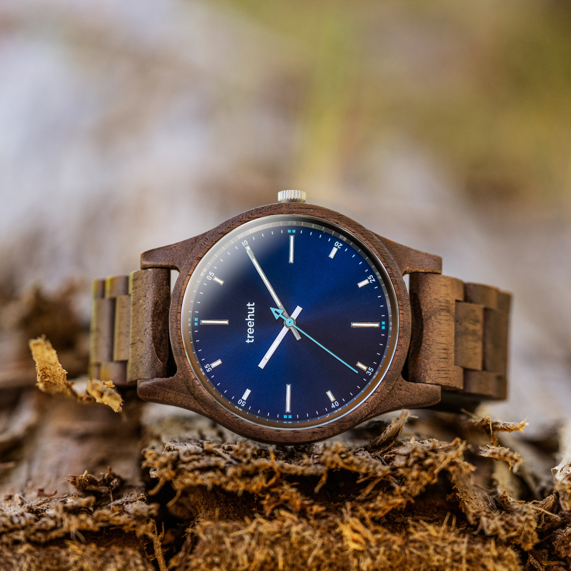 The Dubline Walnut Blue men's watch features a natural walnut wood case paired with a striking blue sunray dial. The silver hour markers and hands glow in the dark for added clarity and style. This engraved wristwatch offers a clean, balanced look with thoughtful detailing. As with all Treehut watches, it reflects a passion for materials that feel meaningful and enduring. Among men’s Treehut watches, this piece stands out for its confident style and everyday versatility. It’s a quiet statement in the world of engraved men’s watches.